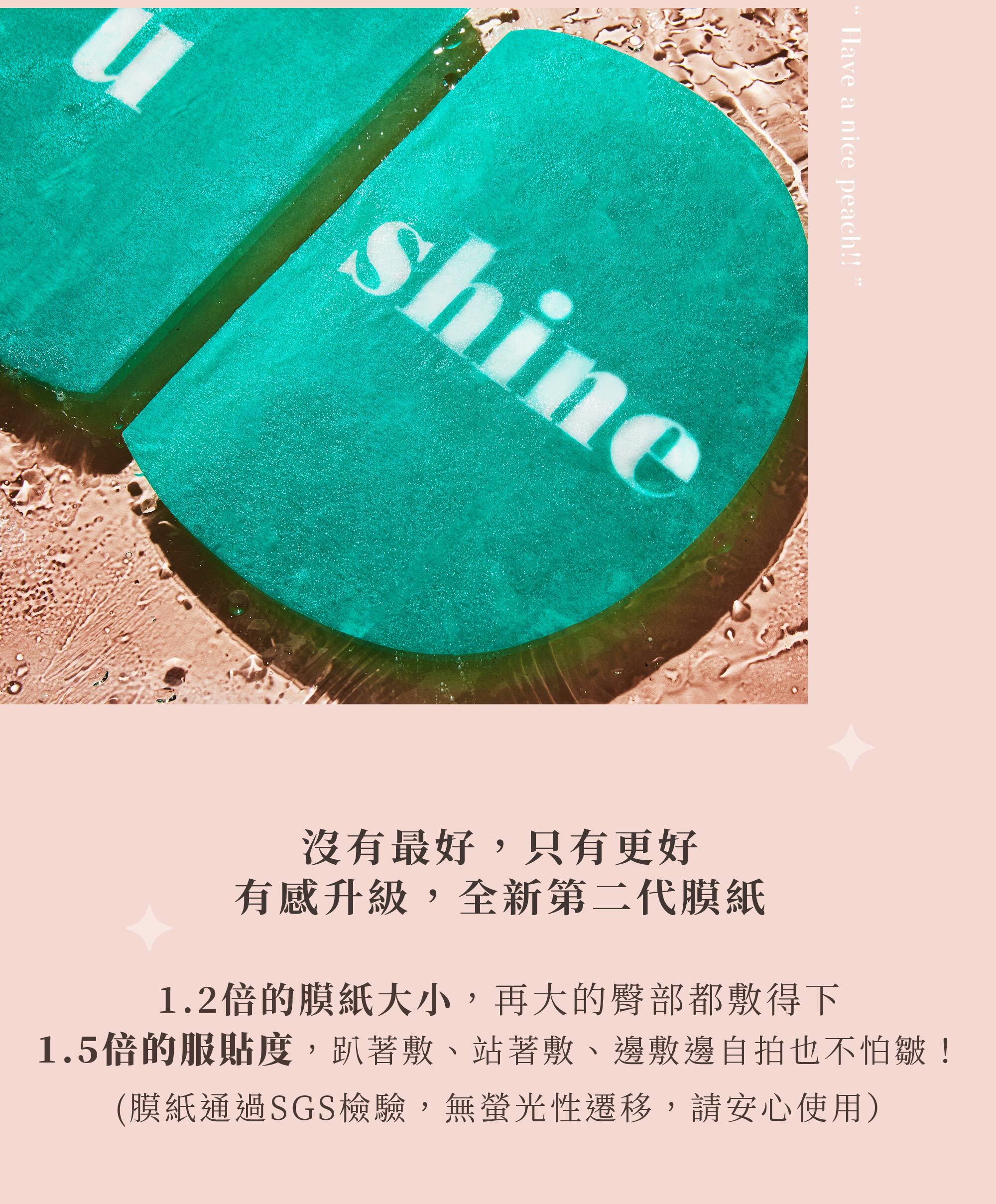 Peachup臀膜,採用厚磅細緻膜紙,大面積完整貼合臀部。給臀部最親膚舒適的照顧!膜紙無螢光性遷移,請安心使用!