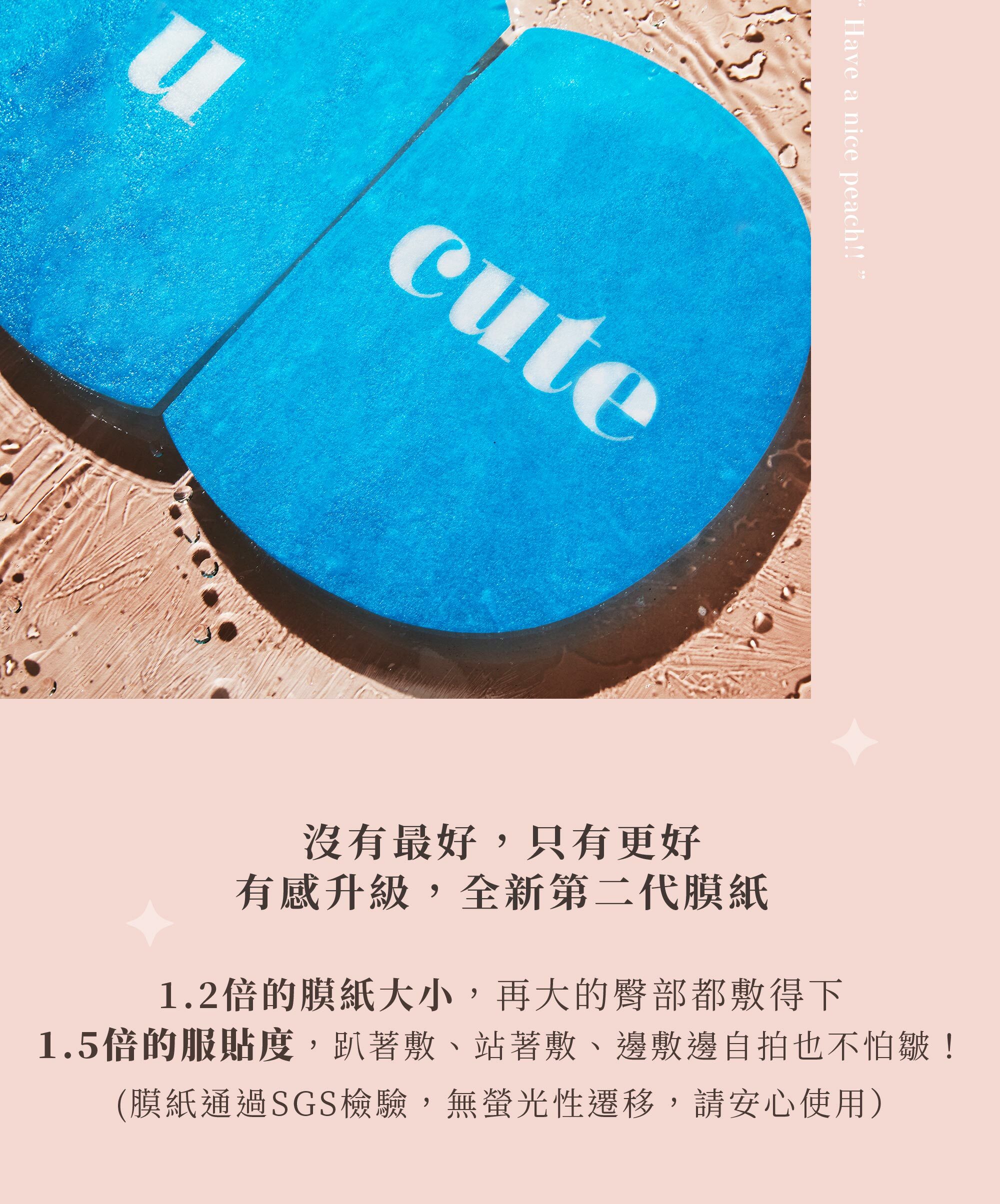 Peachup臀膜,採用厚磅細緻膜紙,大面積完整貼合臀部。給臀部最親膚舒適的照顧!膜紙無螢光性遷移,請安心使用!