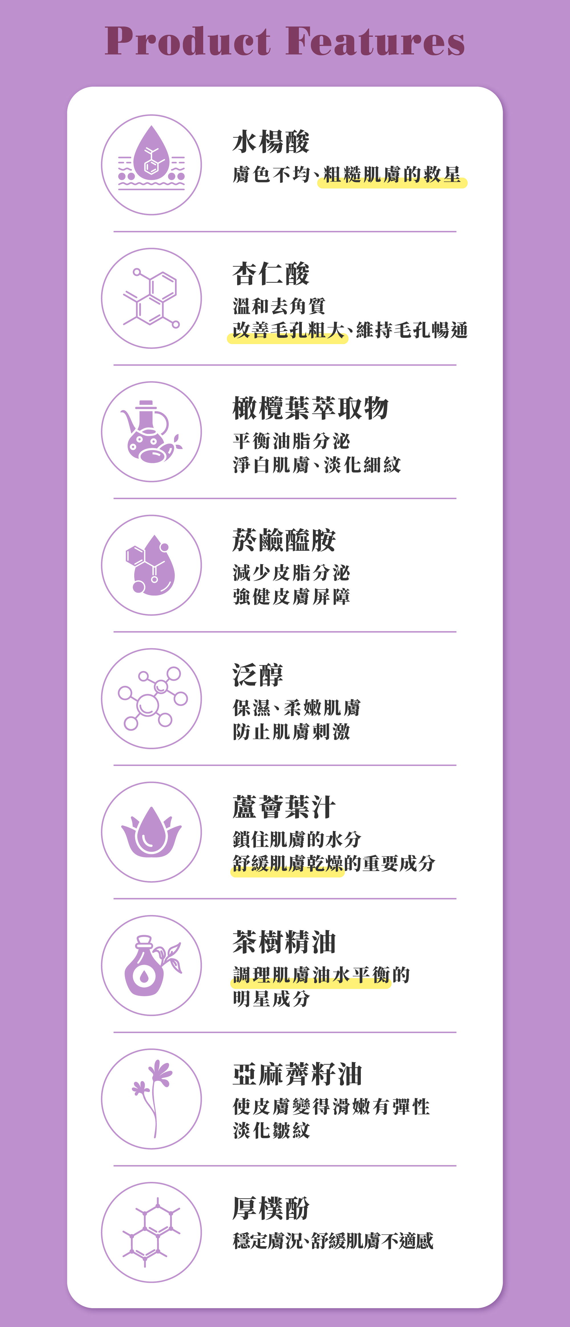 使用水楊酸、杏仁酸、茶樹精油、菸鹼醯胺、厚樸酚等,溫和去角質等明星成分。